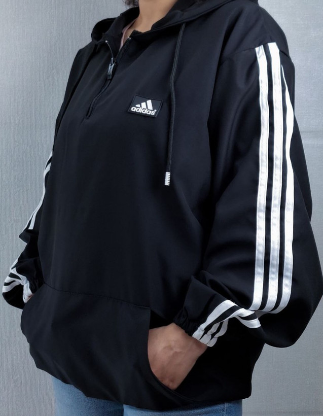 هودی نیم زیپ آدیداس با قد 75 سانتیمتر، دورسینه 125 سانتیمتر و قد آستین 78 سانتیمتر. جنس تی سی ضد آب و فری سایز.
