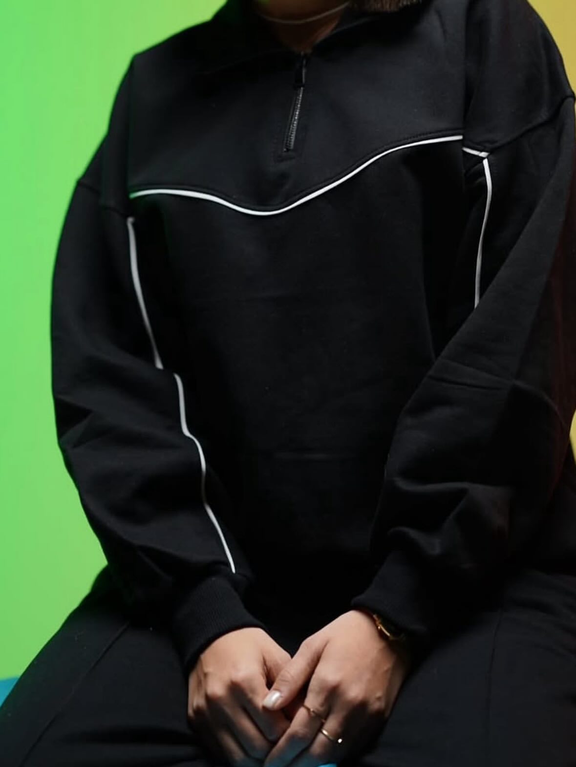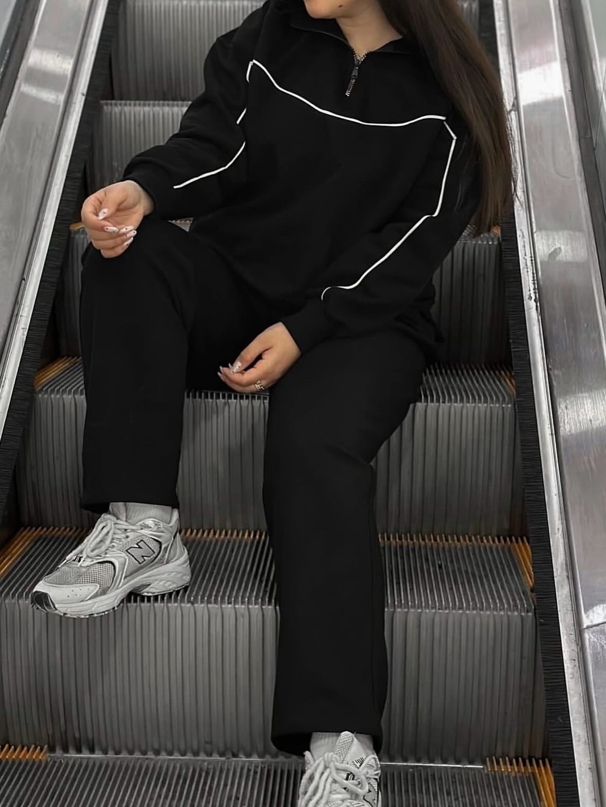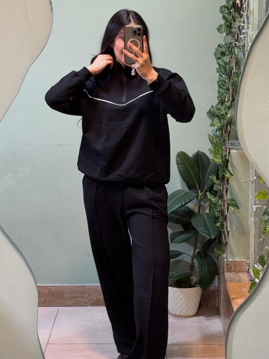جنس دو نخ دورس پنبه داخل کرک فری سایز(مناسب ۴۸) قد دورس ۶۰ عرض لباس درحالت عادی ۱۲۲ قدآستین از یقه ۶۸ دوربازو عادی قد شلوار مام فیت ۱۰۲ فاق بلند کمرکش دوبل. تکرنگ مشکی